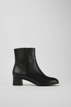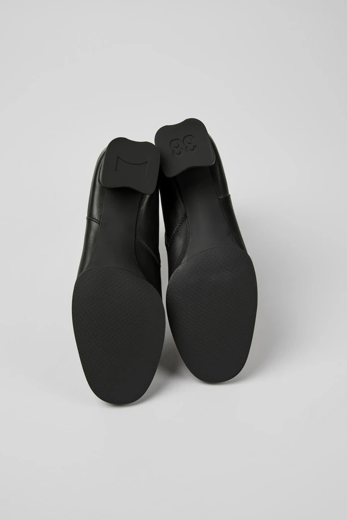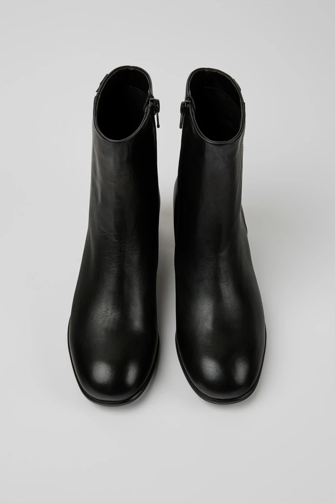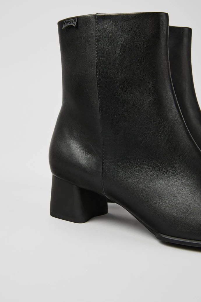 Black leather women’s ankle boots with TPU outsoles (20% recycled).