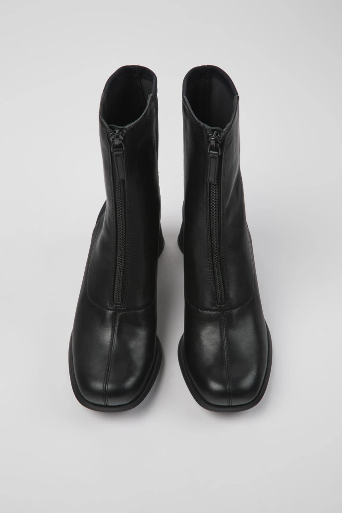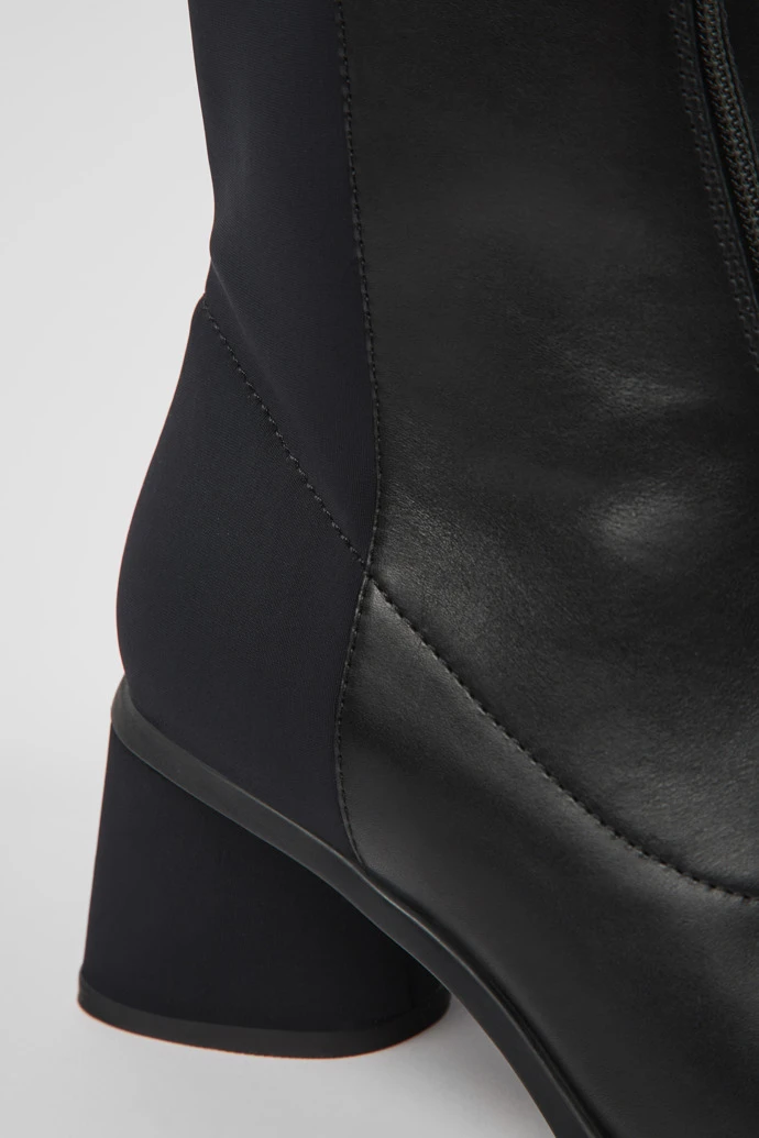 Black leather and recycled PET women’s boots with OrthoLite® Recycled™ non-removable footbeds, and rubber and ABS outsoles.
