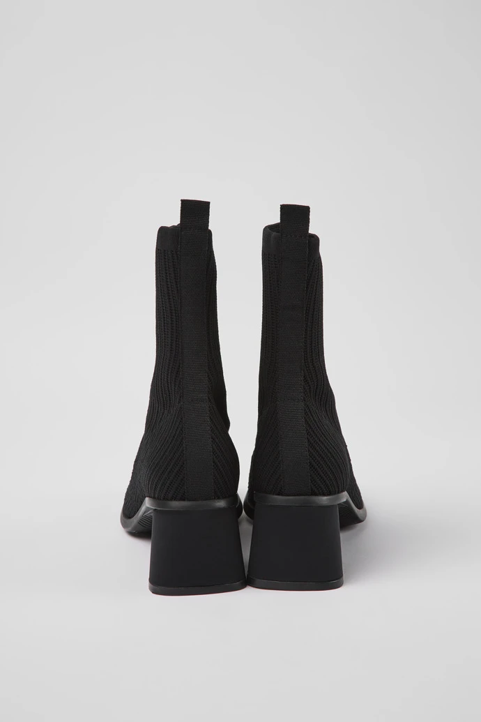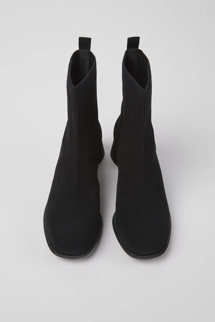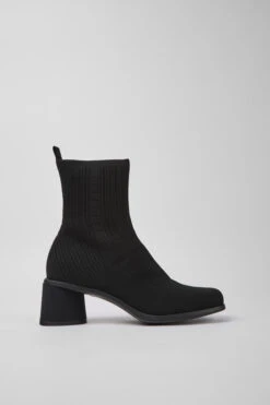 Black water repellent recycled PET one-piece knit women’s boots with OrthoLite® Recycled™ non-removable footbeds, and rubber and ABS outsoles.