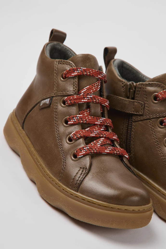 Brown leather kids’ ankle boots with OrthoLite® Recycled™ removable footbeds and rubber outsoles.