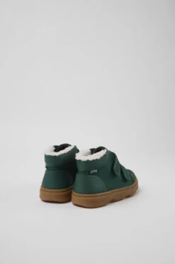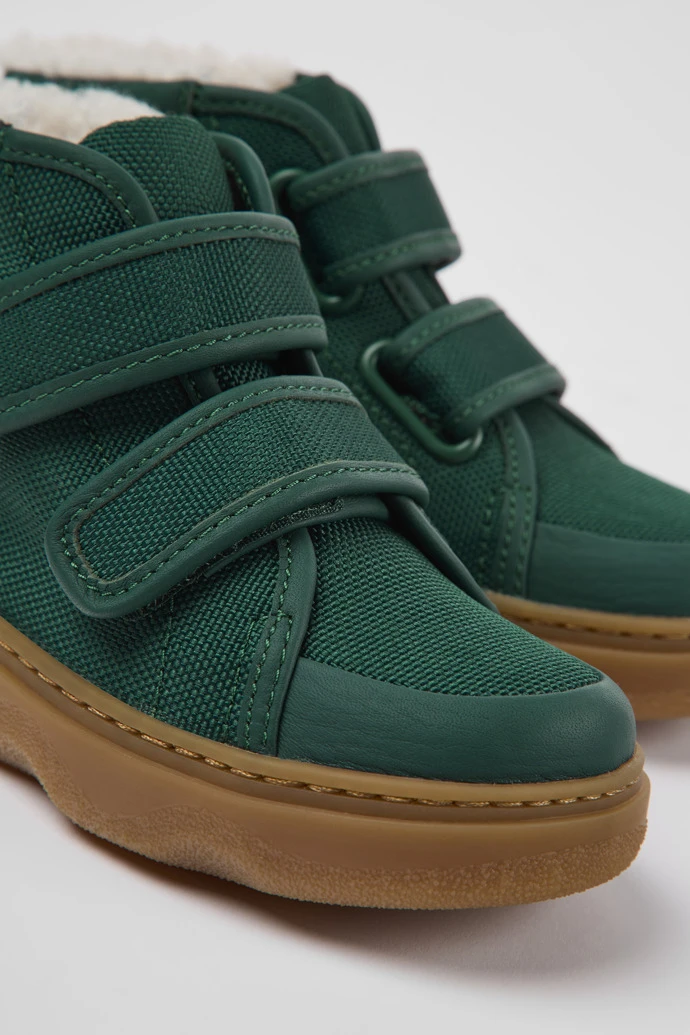 Green leather and textile kids’ ankle boots with a water repellent treatment, OrthoLite® Recycled™ removable footbeds, and rubber outsoles.