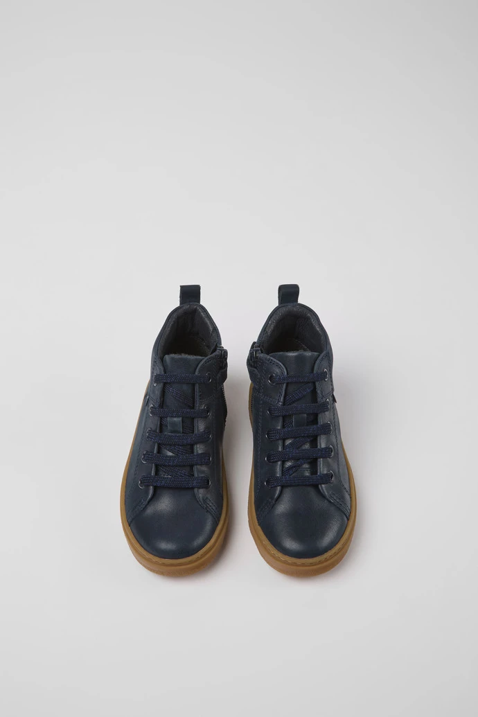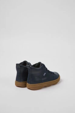 Navy blue leather kids’ ankle boots with OrthoLite® Recycledâ„¢ removable footbeds and rubber outsoles.