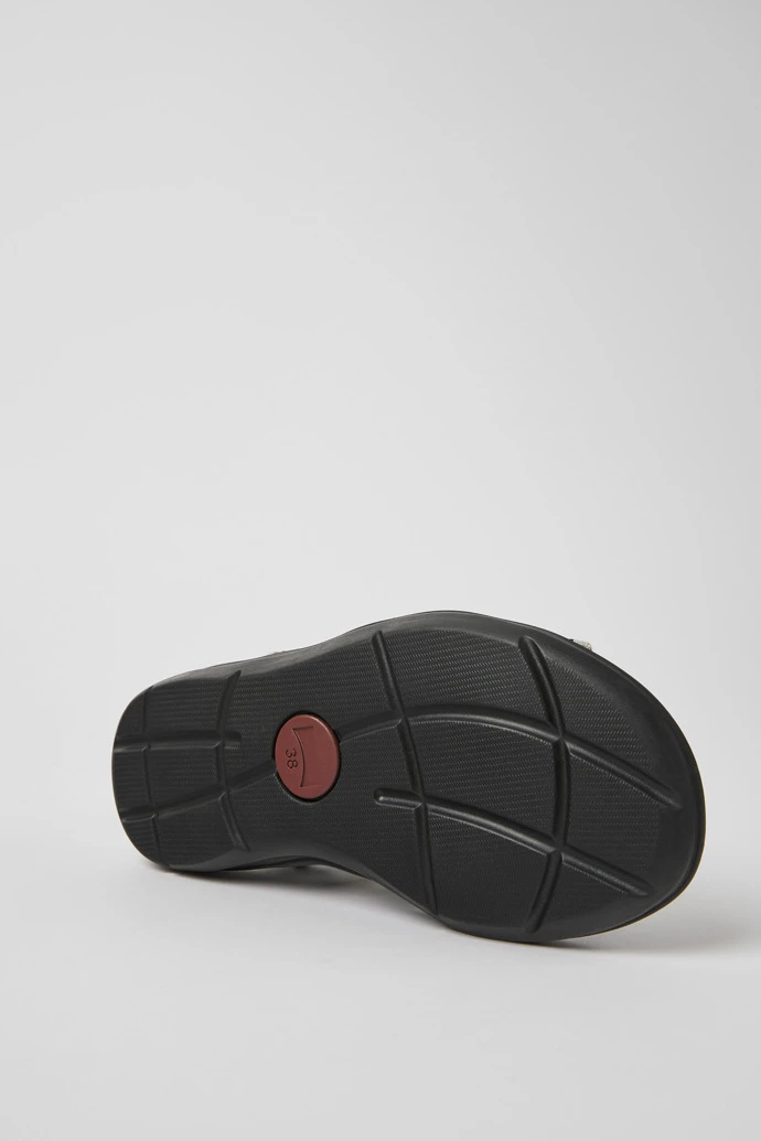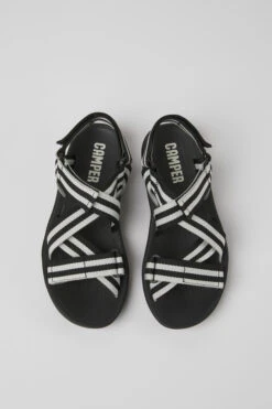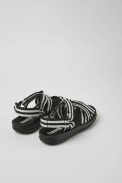 Black and white textile women’s sandals with EVA outsoles.