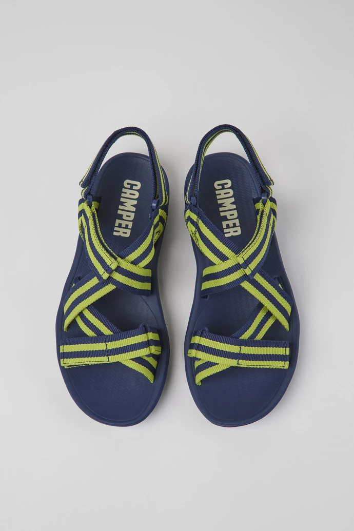 Blue and yellow textile men’s sandals with EVA outsoles.