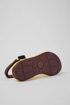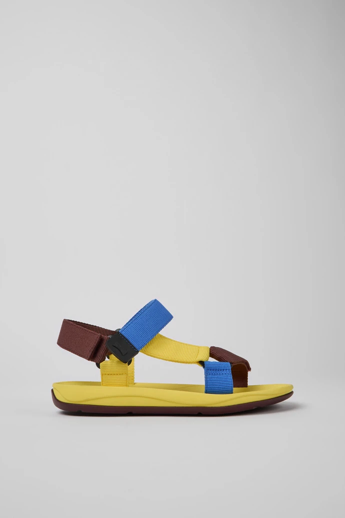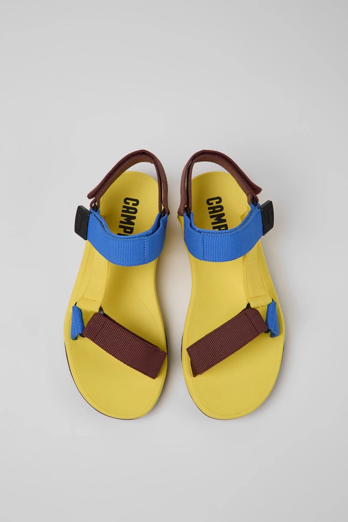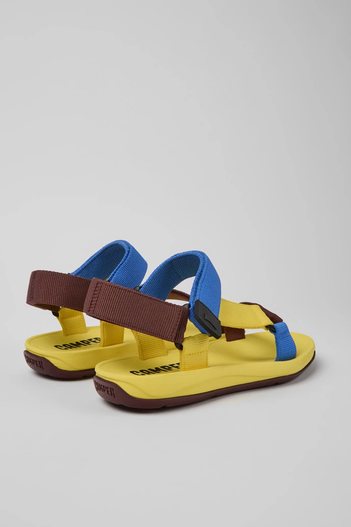 Yellow, blue, and burgundy men’s sandals with 100% recycled PET straps, EVA outsoles, and a hook-and-loop closing system.