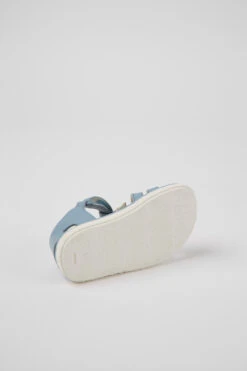 Blue and green leather kids’ sandals with parrot detail, a hook-and-loop closing system, and rubber outsoles.
