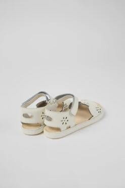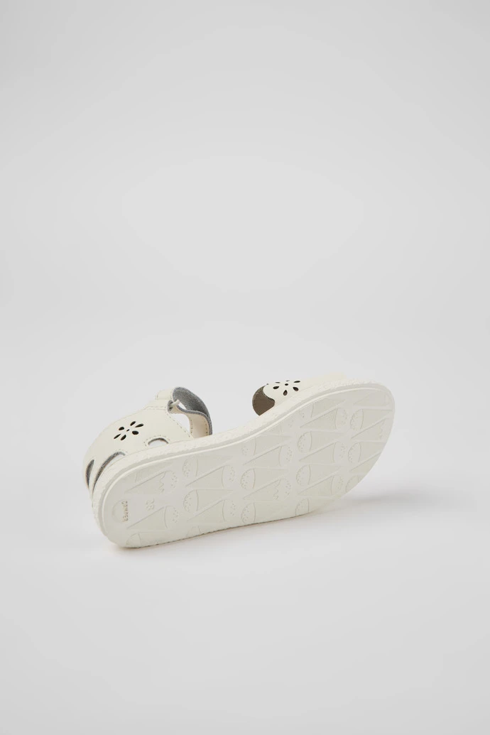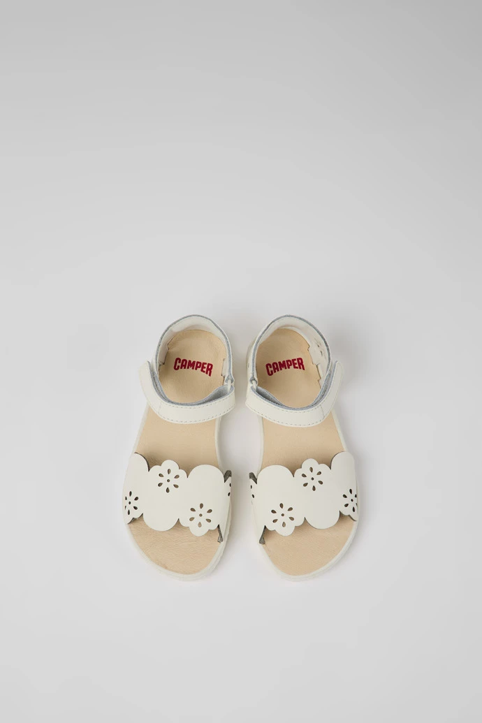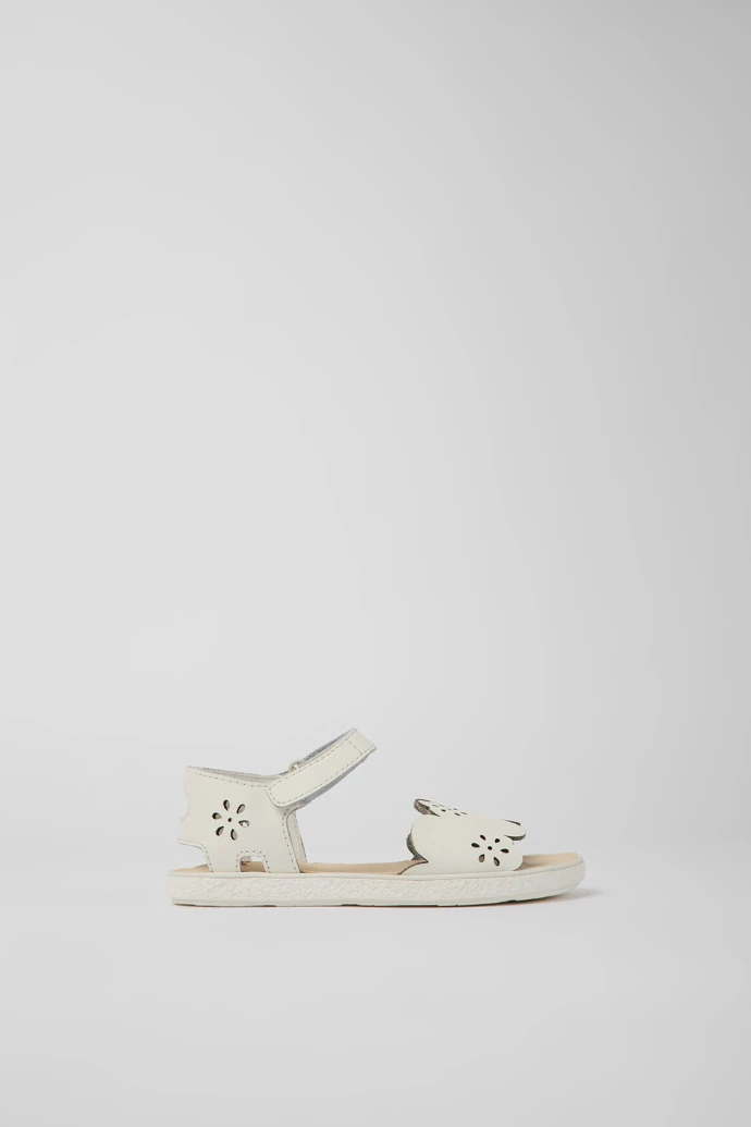 White leather girls’ sandals with hook-and-loop closing system and 100% rubber outsoles.