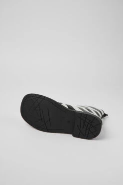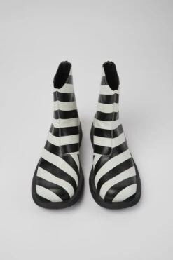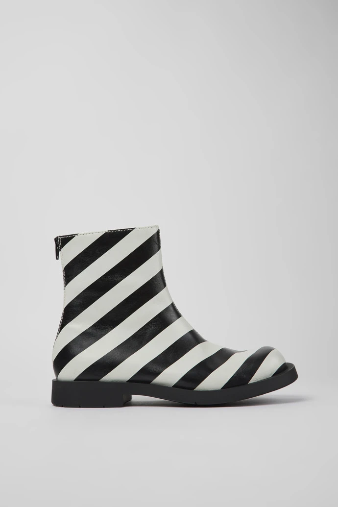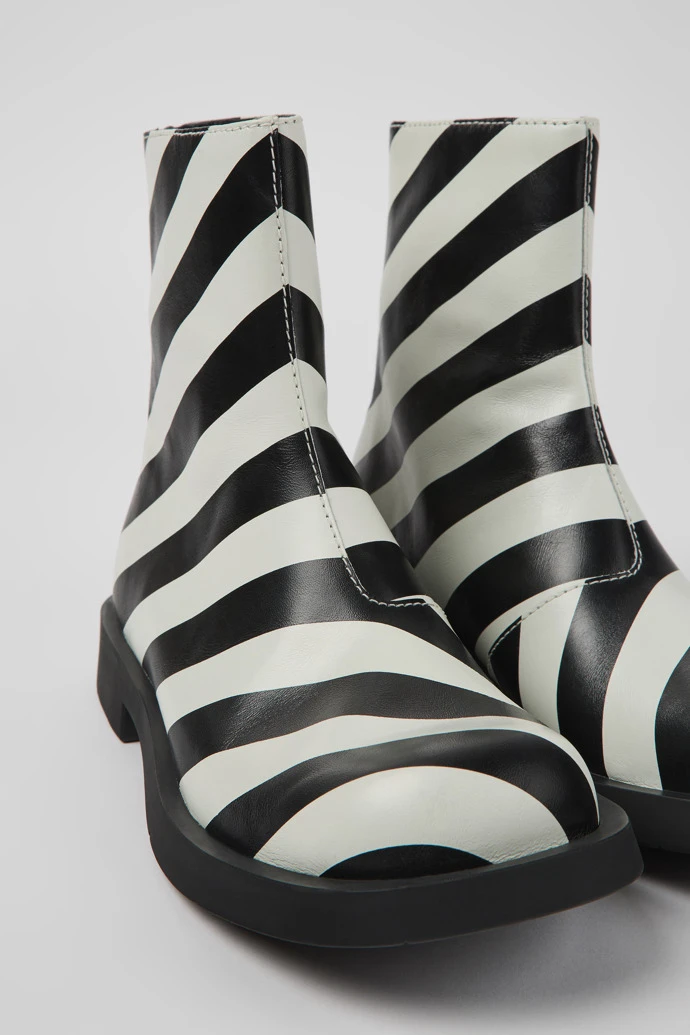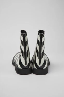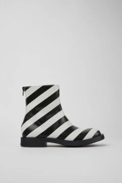 Black and white striped leather men’s ankle boots with OrthoLite® Recycled™ footbeds and rubber outsoles (30% natural, 20% recycled).