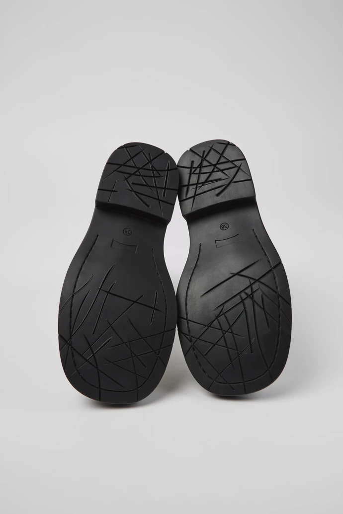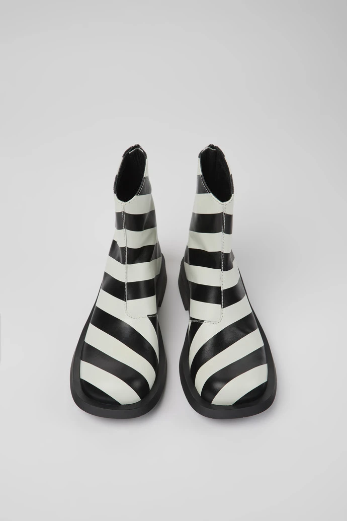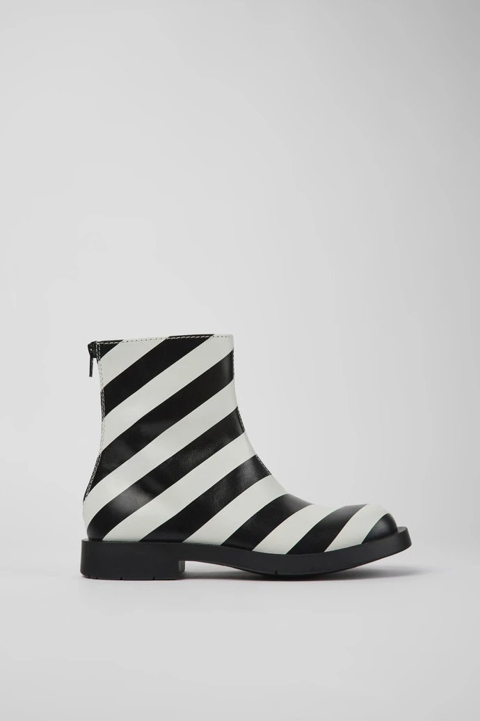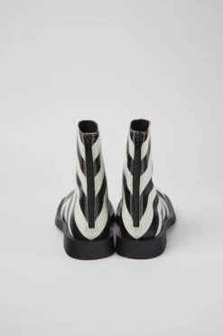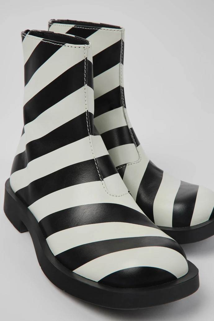 Black and white striped leather women’s ankle boots with OrthoLite® Recycled™ footbeds and rubber outsoles (30% natural, 20% recycled).
