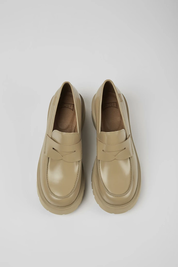 Beige leather women’s loafers with OrthoLite® Recycled™ non-removable footbeds and EVA outsoles.