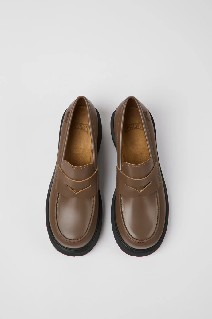 Brown leather women’s loafers with OrthoLite® Recycled™ non-removable footbeds and EVA outsoles.