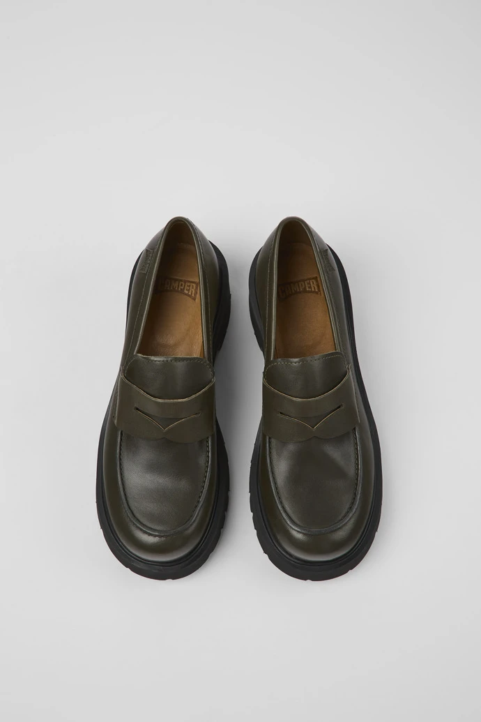 Green leather women’s loafers with OrthoLite® Recycled™ non-removable footbeds and EVA outsoles.
