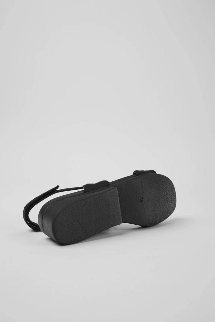 Black recycled PET and recycled nylon women’s sandals with 100% rubber outsoles (20% recycled) and a hook-and-loop closing system.