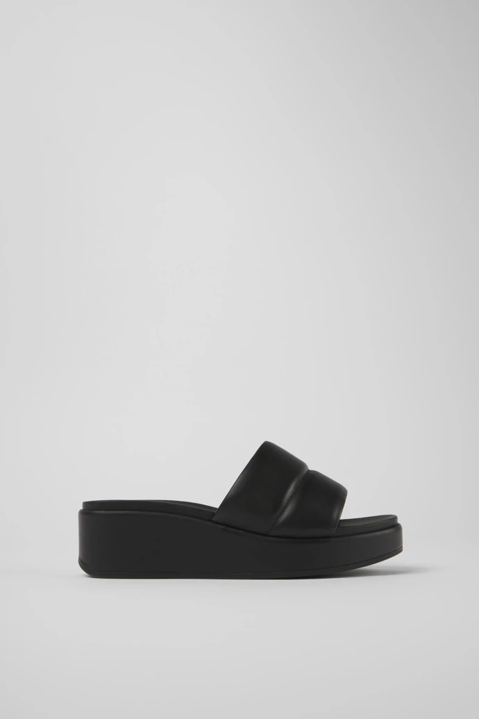 Black leather women’s sandals with non-removable PU footbeds and PU outsoles.