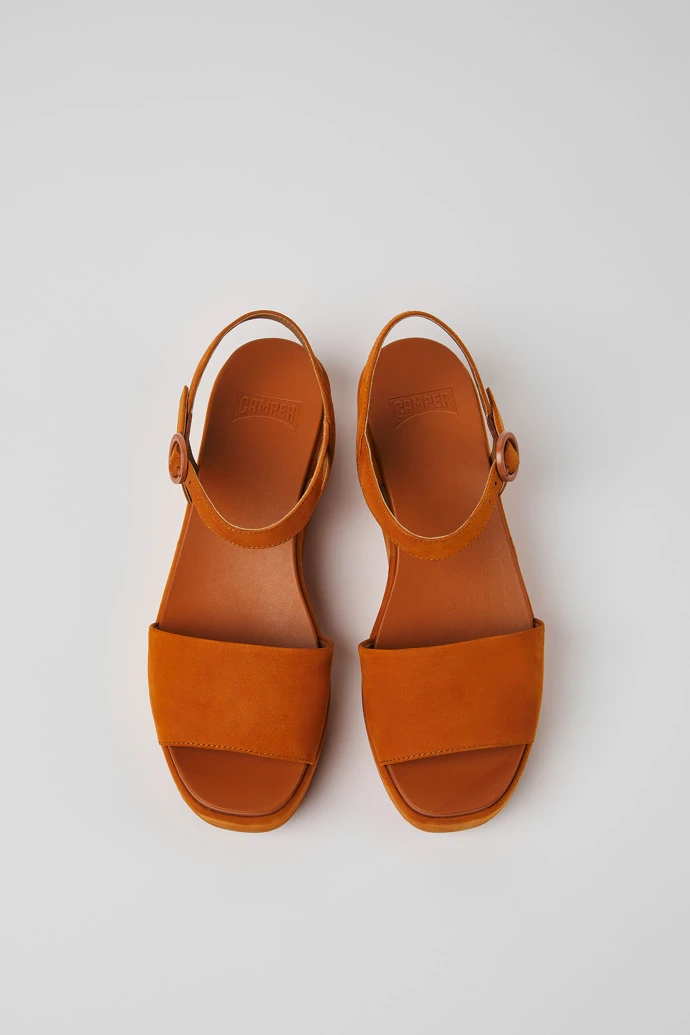 Brown nubuck women’s sandals with non-removable PU footbeds and PU outsoles.