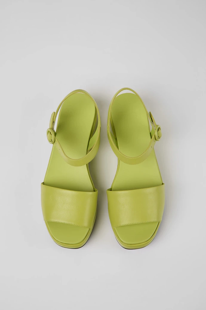 Green leather women’s sandals with non-removable PU footbeds and PU outsoles.