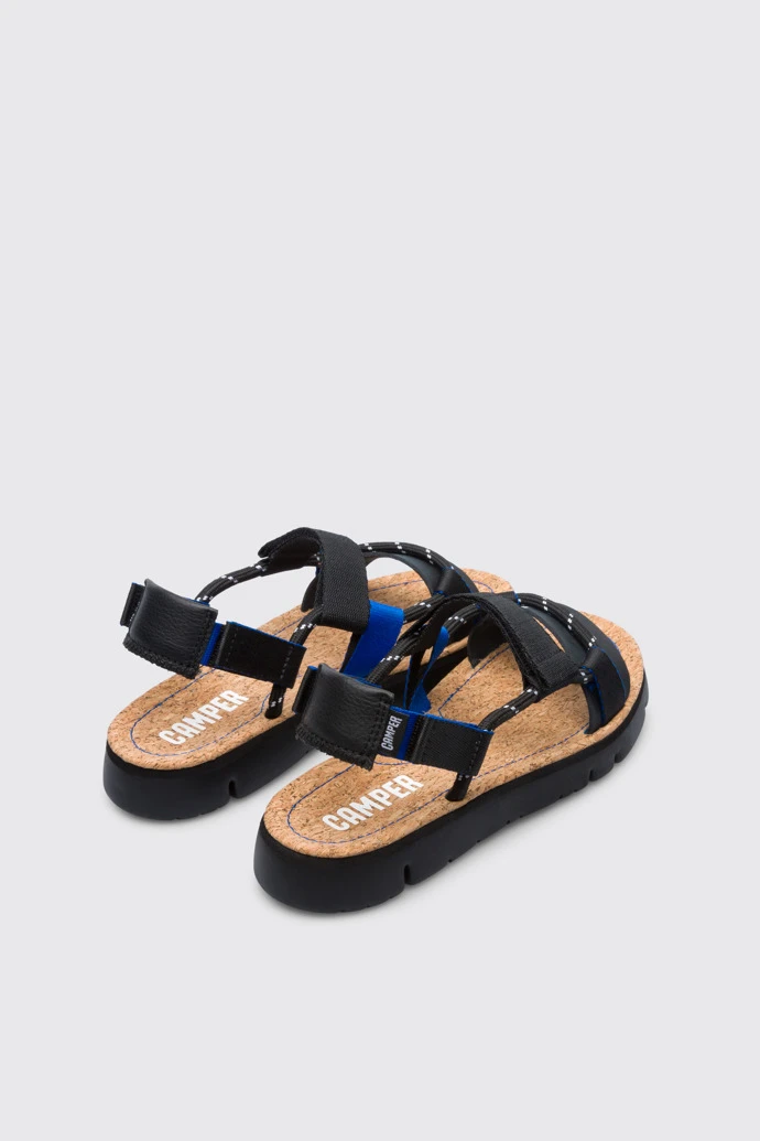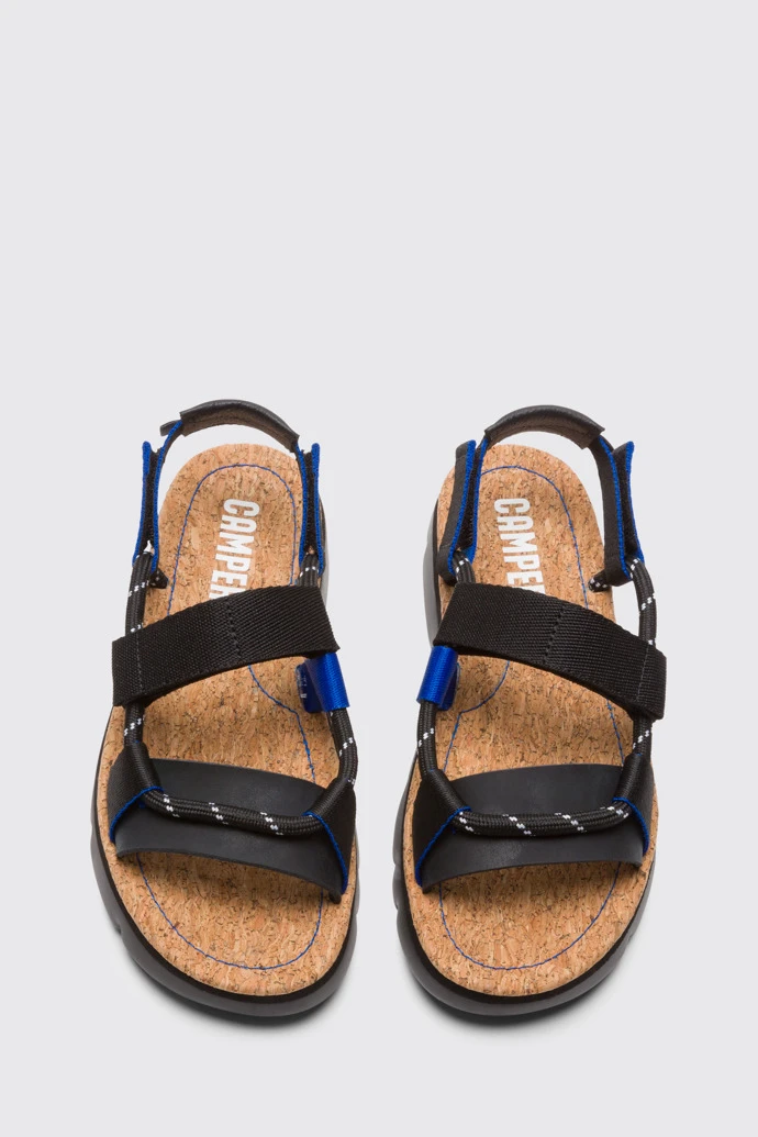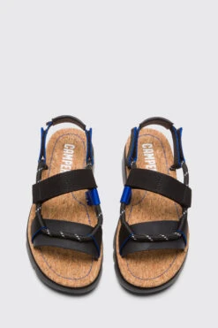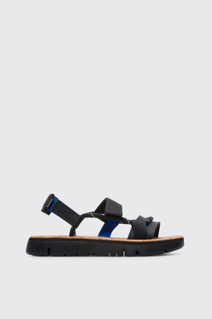 Multicoloured velcro sandal for women. Black and blue fabric upper with small details in black. 100% black EVA outsole.