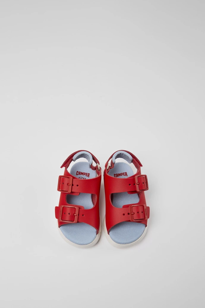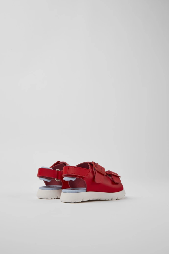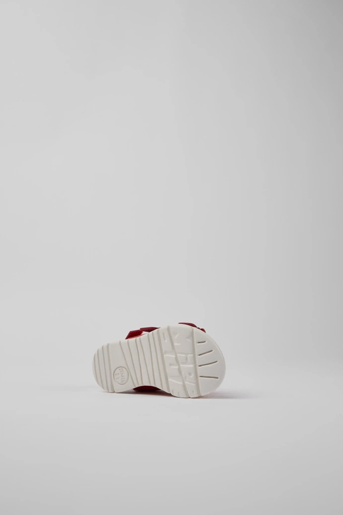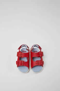 Red leather kids’ sandals with hook-and-loop closing system, adjustable buckles, and 100% EVA outsoles.