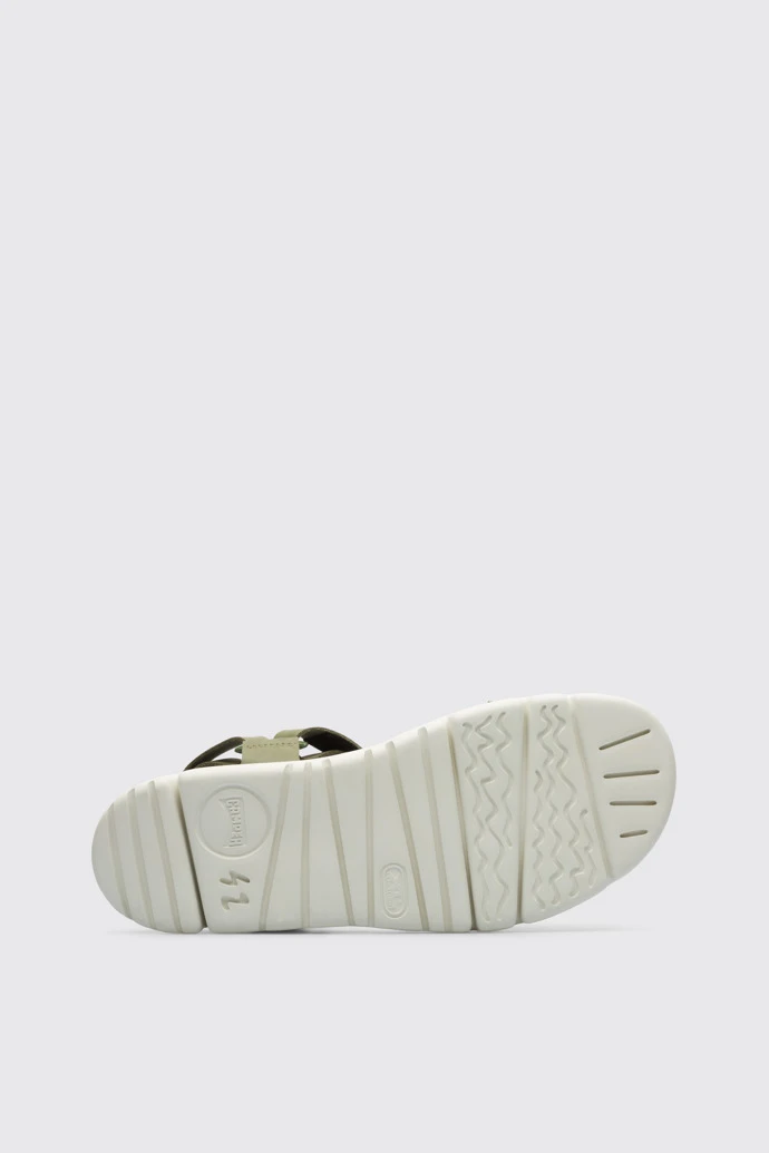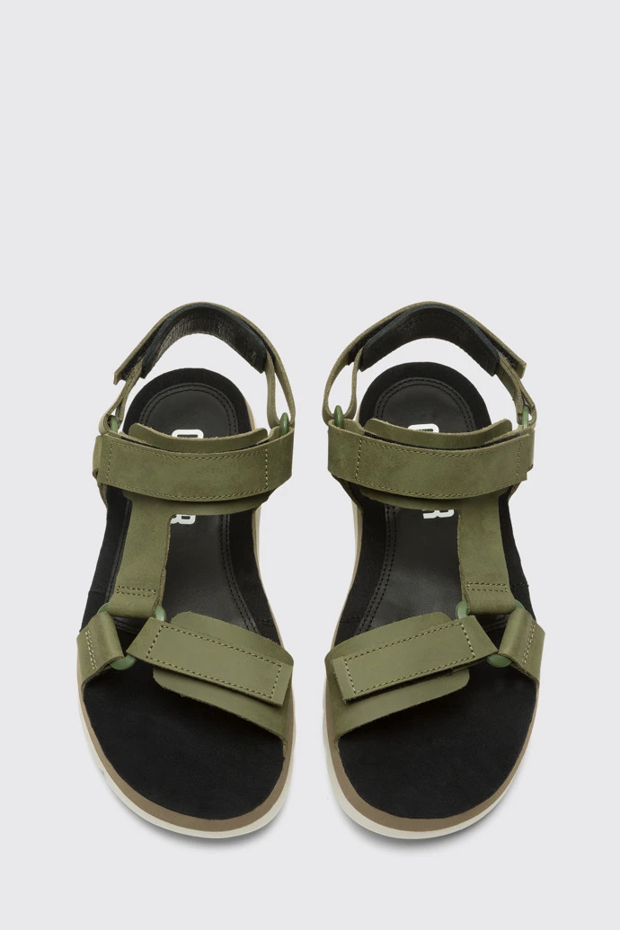 Sandal for men in green with velcro straps. Leather upper with rubberized finish and grey and black details. Grey EVA outsole.