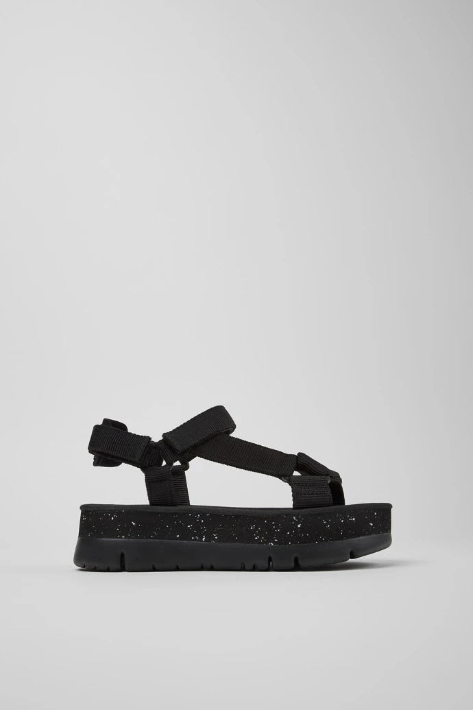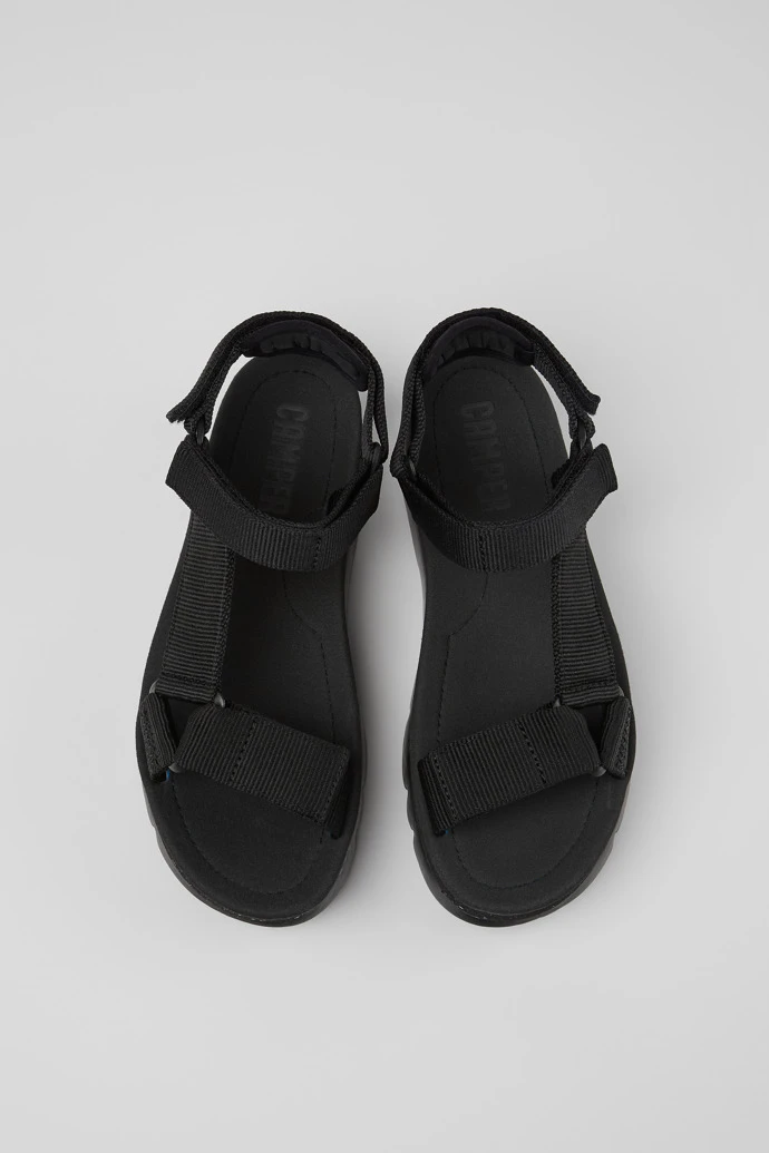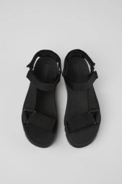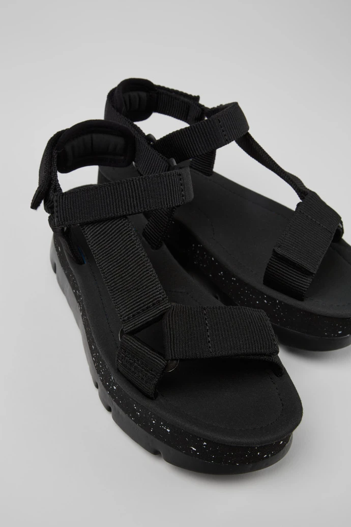 Black recycled PET women’s sandals with 100% EVA midsoles (20% recycled), XL EXTRALIGHT® outsoles (51% recycled), and a hook-and-loop closing system.