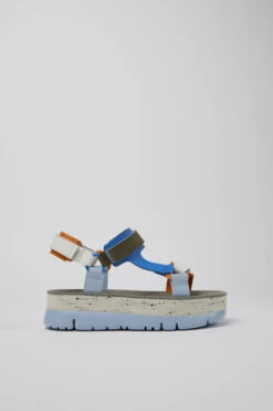 Blue, orange, and white leather women’s sandals with 100% EVA midsoles (20% recycled), XL EXTRALIGHT® Organix™ (30% bio-based sugarcane), and a hook-and-loop closing system.