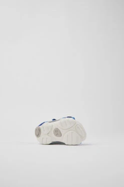 Blue kids’ sandals made with 55% coffee yarn fabric, with hook-and-loop closing system, and EVA and rubber outsoles.