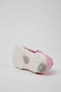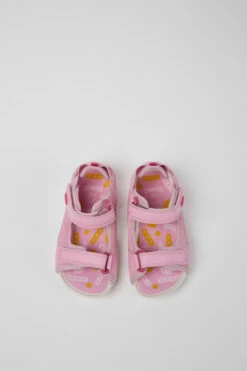 Pink leather and coffee yarn kids’ sandals with hook-and-loop closing system, and EVA and rubber outsoles.