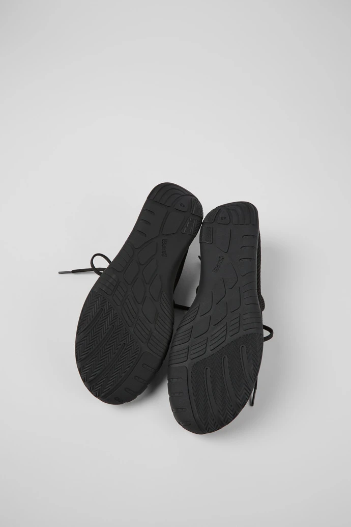 Black recycled PET knitted men’s sneakers with a water repellent treatment, OrthoLite® Recycled™ removable footbeds, and rubber outsoles (40% natural, 23% recycled).