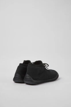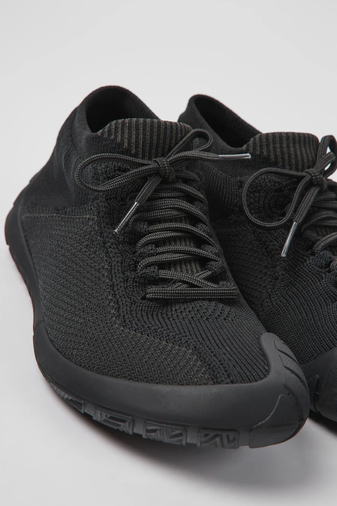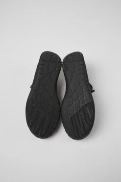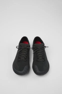 Black recycled PET knitted women’s sneakers with a water repellent treatment, OrthoLite® Recycled™ removable footbeds, and rubber outsoles (40% natural, 23% recycled).