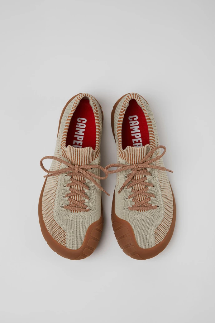 Gray and brown recycled PET one-piece knit men’s sneakers with OrthoLite® Recycled™ removable footbeds and rubber outsoles (40% natural, 23% recycled).