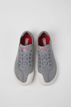 Gray recycled PET men’s sneakers with OrthoLite® Recycled™ removable footbeds and rubber outsoles (40% natural, 23% recycled).