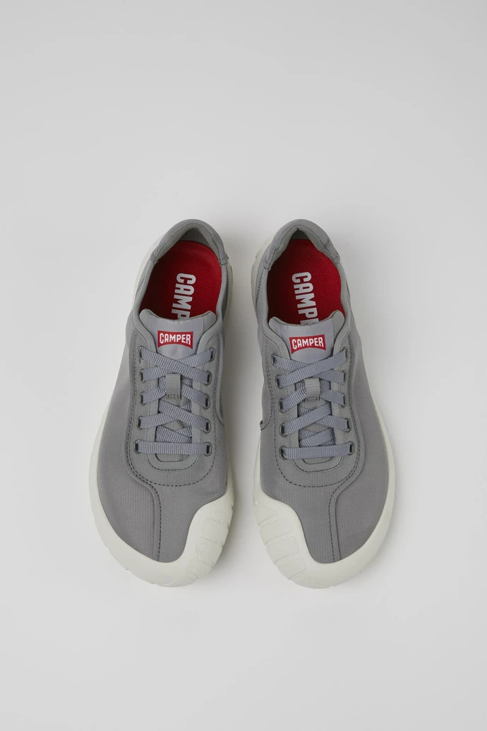 Gray textile women’s sneakers with OrthoLite® Recycled™ removable footbeds and rubber outsoles (40% natural, 23% recycled).