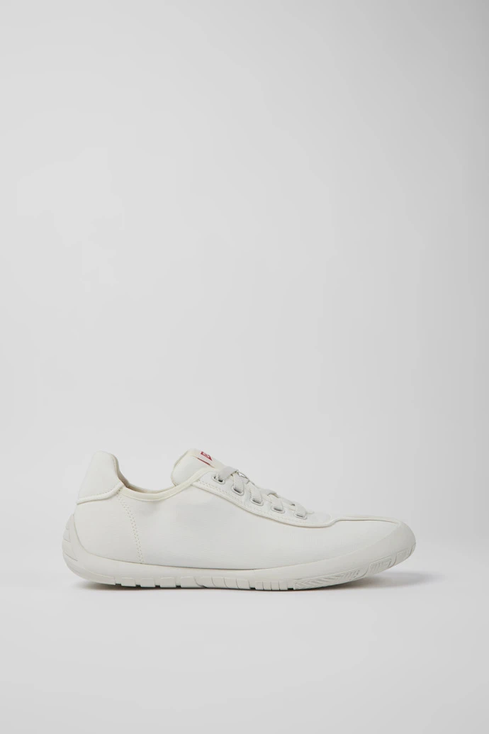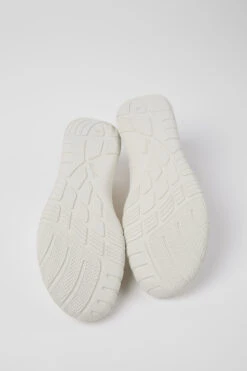 White recycled PET men’s sneakers with OrthoLite® Recycled™ removable footbeds and rubber outsoles (40% natural, 23% recycled).