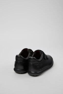 Black leather and textile kids’ shoes with hook-and-loop closing system and rubber outsoles.