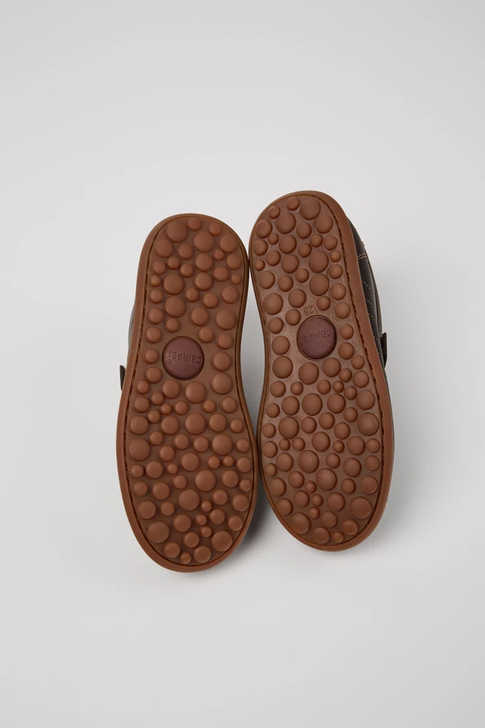 Dark brown leather and textile kids’ shoes with hook-and-loop closing system and rubber outsoles.