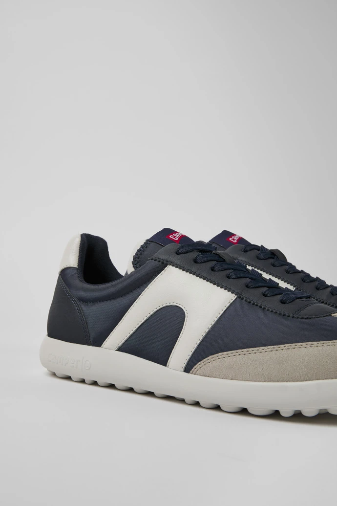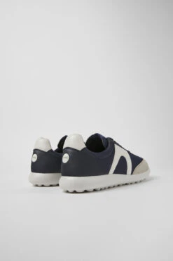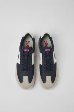 Blue textile and leather men’s sneakers with removable PU footbeds and EVA outsoles.