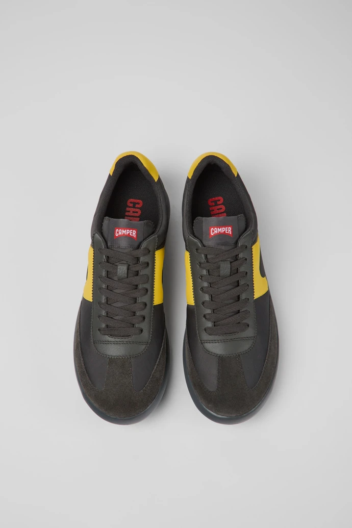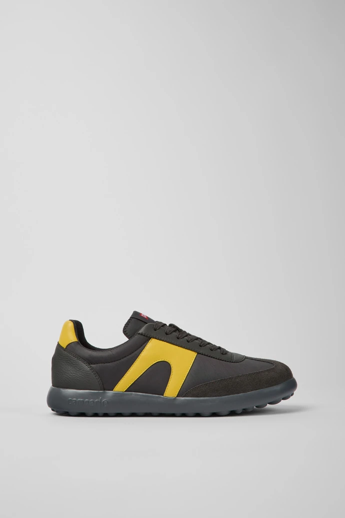 Gray textile and leather men’s sneakers with removable PU footbeds and EVA outsoles.