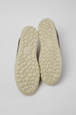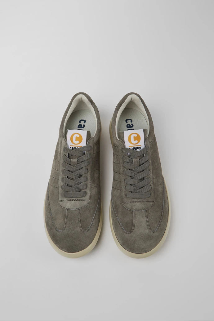 Grey nubuck men’s sneakers with 100% recycled EVA outsoles.