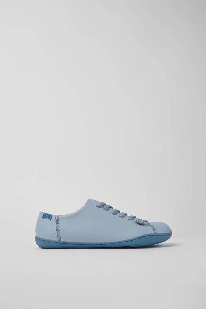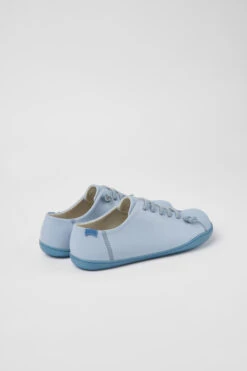 Blue leather women’s shoes with removable PU footbeds and TPU outsoles (20% recycled).