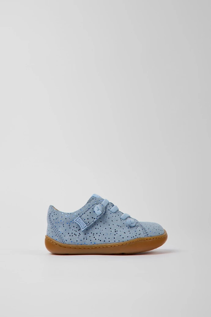 Blue nubuck kids’ shoes with easy-fit elastic laces, EVA footbeds, and rubber outsoles.