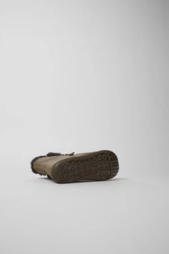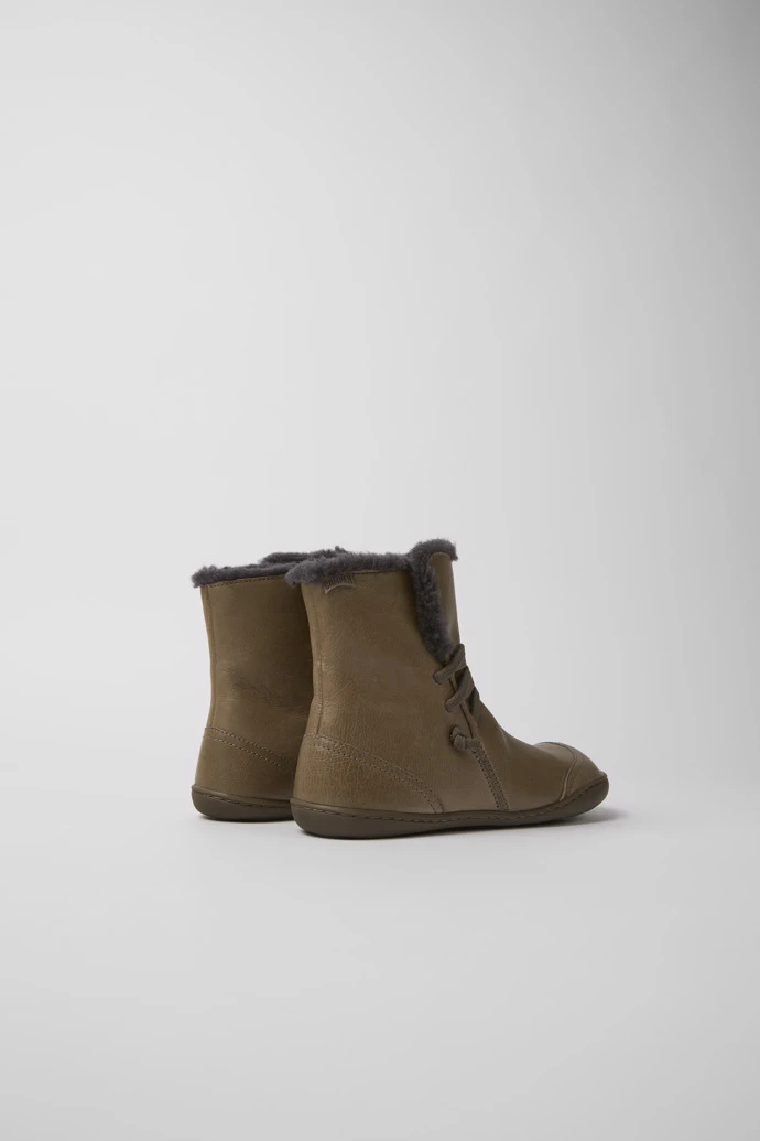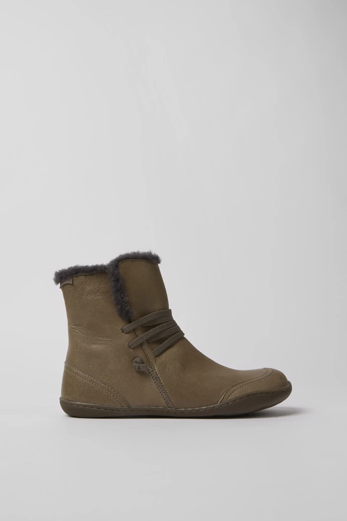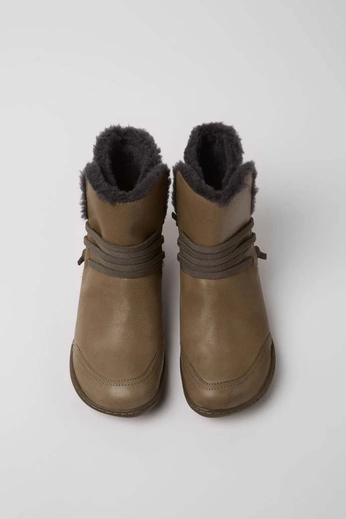 Brown-gray leather women’s ankle boots with TPU outsoles (20% recycled).