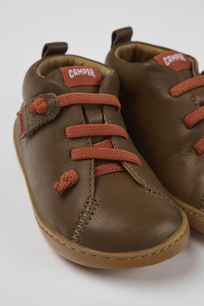 Brown leather kids’ shoes with hook-and-loop closing system and rubber outsoles (20% recycled).