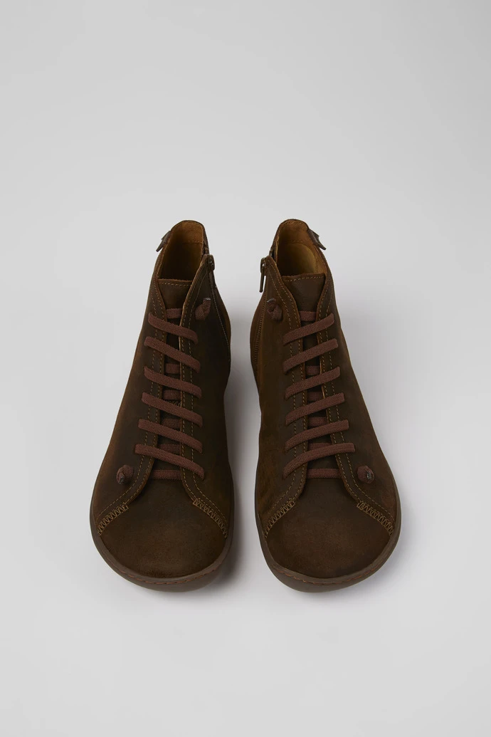 Brown nubuck men’s ankle boots with removable PU footbeds and TPU outsoles (20% recycled).
