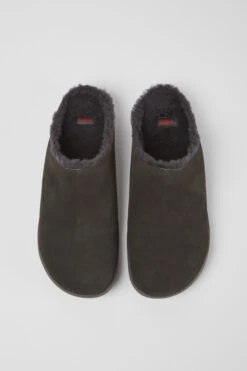Dark grey nubuck men’s shoes with 20% recycled TPU outsoles.