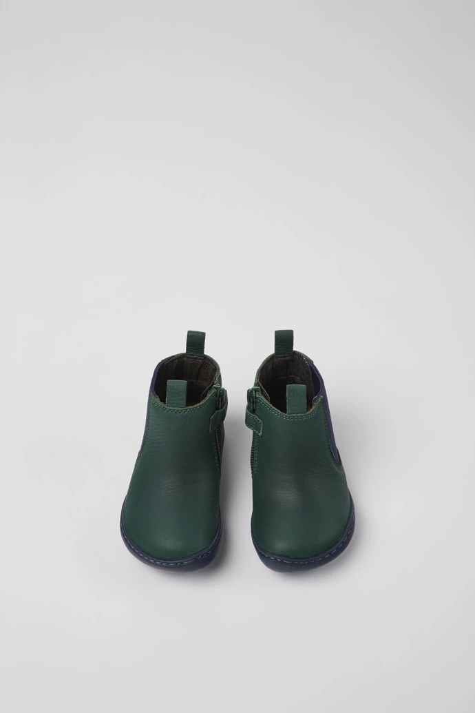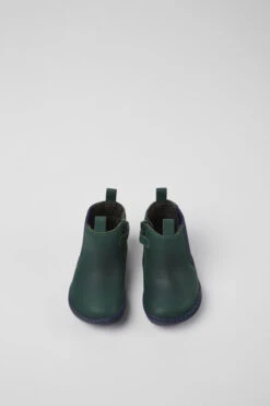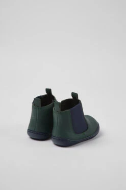 Green and blue leather kids’ boots with rubber outsoles (20% recycled).