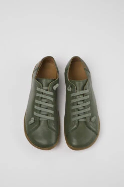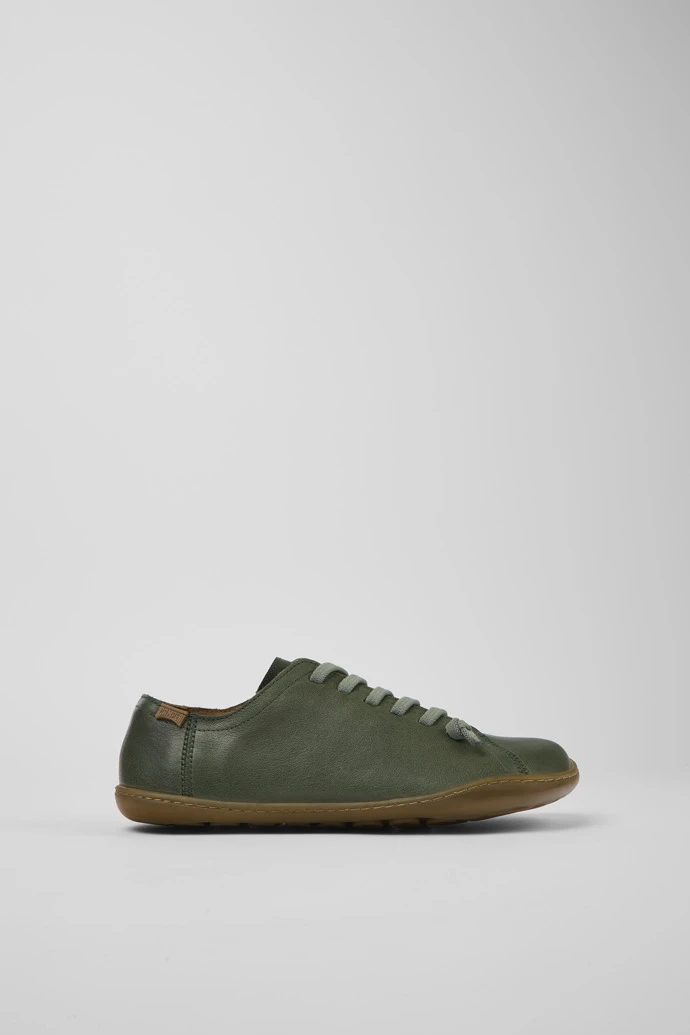 Green leather women’s shoes with removable PU footbeds and TPU outsoles (20% recycled).