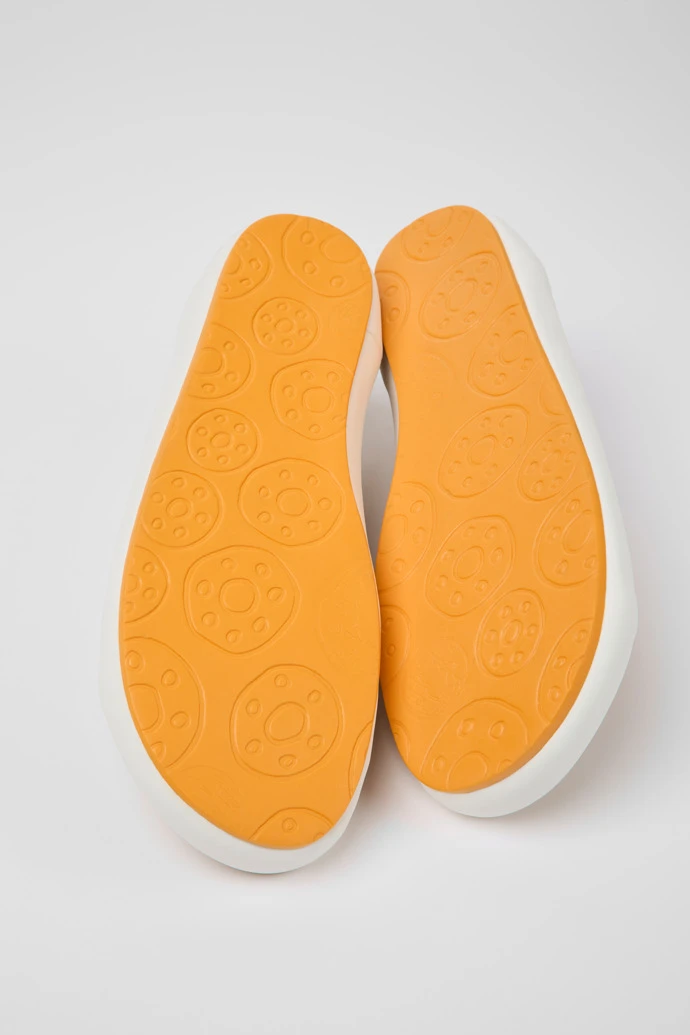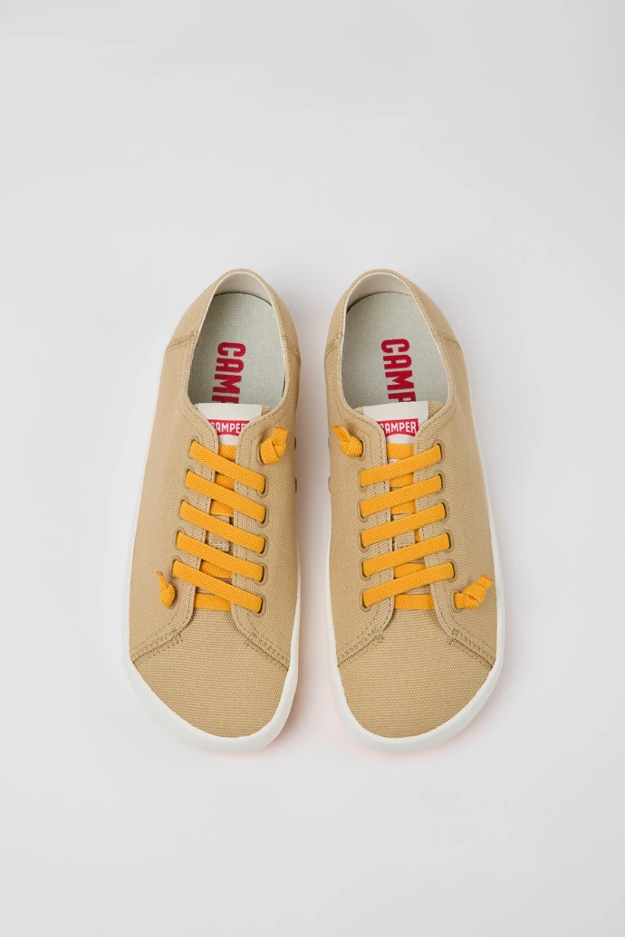 Beige textile men’s sneakers with OrthoLite® Recycled™ removable footbeds and rubber outsoles.
