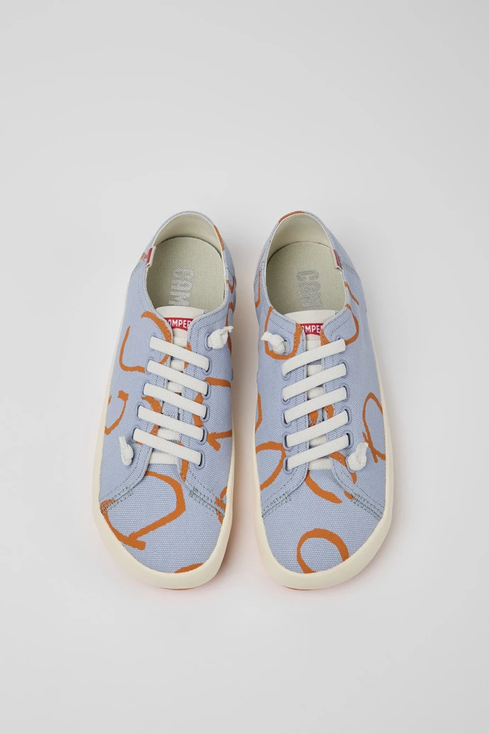 Blue and orange printed 100% recycled cotton men’s sneakers with 100% rubber outsoles and elastic laces.