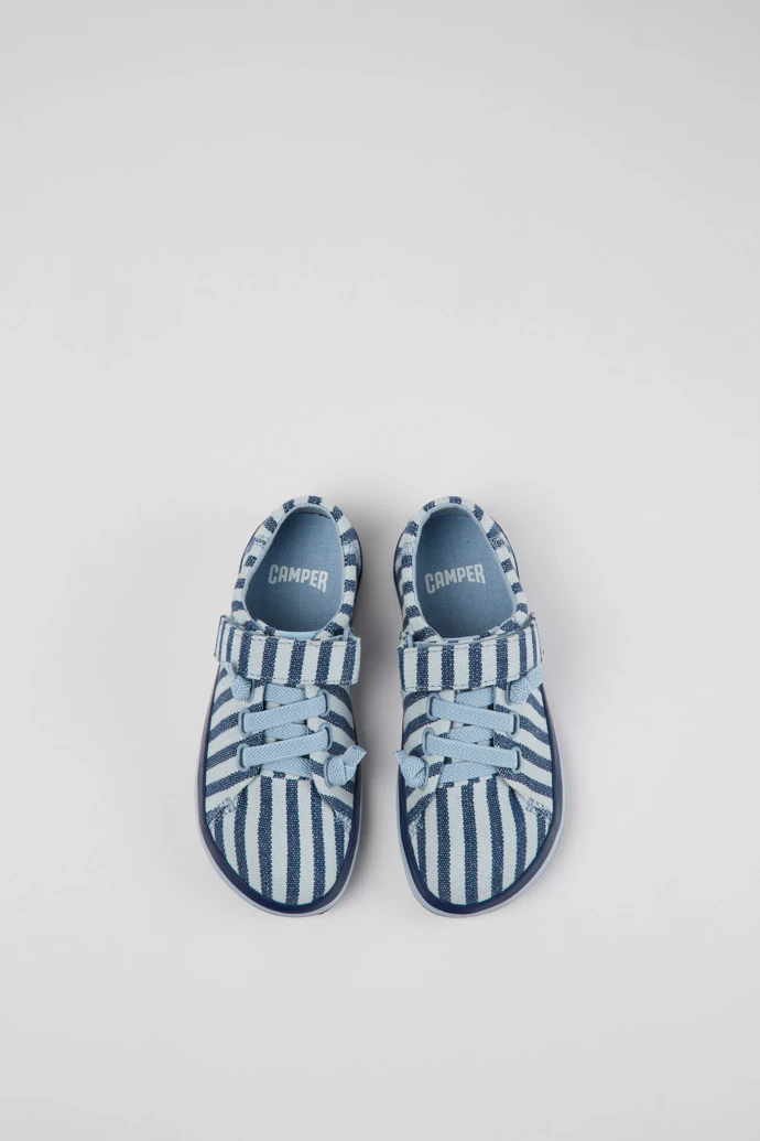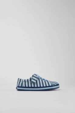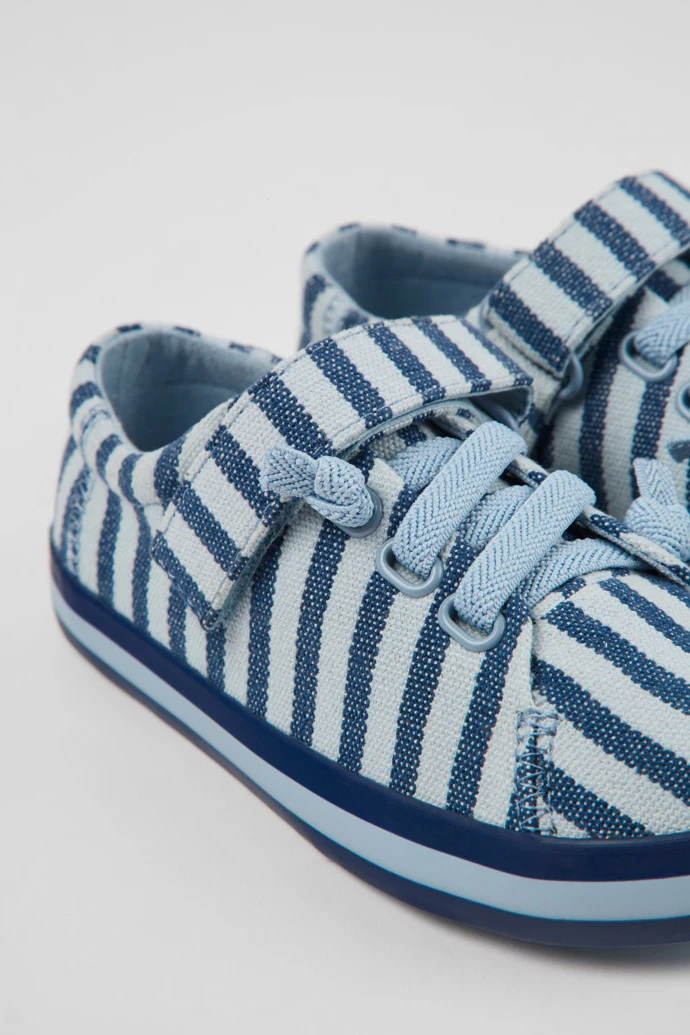 Blue striped recycled cotton kids’ shoes with OrthoLite® Recycled™ removable footbeds and rubber outsoles.