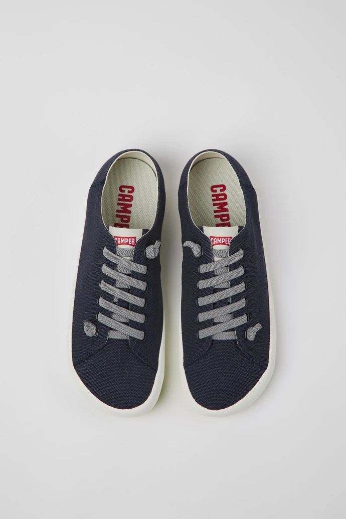Blue textile men’s sneakers with OrthoLite® Recycled™ removable footbeds and rubber outsoles.